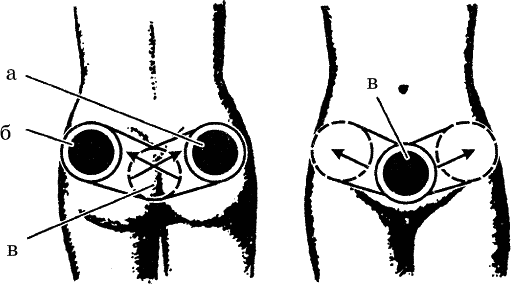 Затем перемещаем чуть ниже, за мочевой пузырь (в), где также удерживаем 8–10 секунд, не меняя силы ощущений.