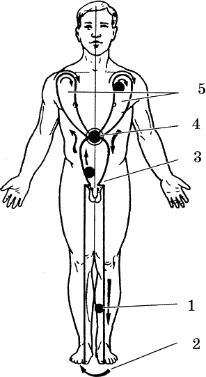 2. Переходим на ноги. Начинаем с левой стопы (2), поднимаемся вверх по ноге, захватывая ее полностью (6), насквозь. Далее через мочевой пузырь переходим на правую ногу, опускаясь до стопы, затем вновь переходим на левую стопу (2) и повторяем этот проход еще раз, заканчивая его в правой стопе.