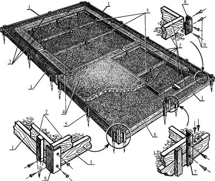 Рис. 4.18. Фундамент: 1 – опалубка для отмостки; 2 – опалубка фундамента; 3 – распорные доски; 4 – бетон; 5 – стойки опалубки; 6 – гравийно-песчаная подсыпка; 7 – специальный соединительный элемент; 8 – соединительный уголок; 9 – шурупы