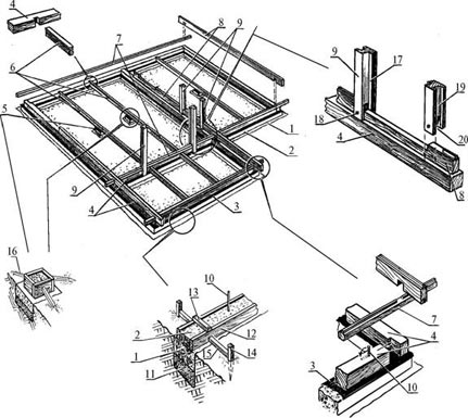 Рис. 4.19. Устройство фундамента и нижней обвязки: 1 – ленточный фундамент; 2 – цоколь; 3 – рубероид; 4 – нижняя обвязка; 5 – подлаговые столбики; 6 – лаги; 7 – продольные элементы первого венца; 8 – поперечные элементы первого венца; 9 – стойки дверных коробок; 10 – анкер; 11 – песчаная подушка; 12 – доски опалубки; 13 – накладка; 14 – опорный кол; 15 – распорка; 16 – подкос; 17 – притвор; 18 – нагель; 19 – паз для крепления перегородки; 20 – сквозной паз