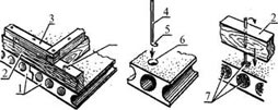 Рис. 4.20. Анкерное крепление: 1 – плиты фундамента; 2 – опорный брус; 3 – нижняя обвязка; 4 – анкер; 5 – подпятник; 6 – отверстие под анкер; 7 – бетонные заглушки