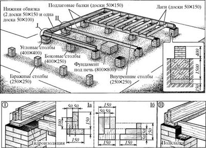 Фундамент дома по рис. 4.13 выполнен столбчатым (рис. 4.21), с сечением надземной части угловых столбов 40х40 см (полтора на полтора кирпича) и боковых 40х25 см (полтора кирпича на кирпич). Внутри периметра сделаны опоры (25х25 см) под подлаговые балки. Печной фундамент выполнен отдельным. Подземная часть столбов заливалась бетонной смесью по песчано-гравийной подсыпке с мокрой трамбовкой. Надземная часть столбов выложена из кирпича с уровня на один-два ряда ниже исходного уровня земли. Именно в процессе кладки кирпичной части столбов тщательно выверяются и контролируются размеры фундамента в плане.