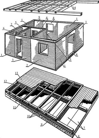 Рис. 4.39. Конструкция коробки дома с привязкой к фундаменту: 1 – угловой щит глухой; 2 – угловой щит с оконным проемом; 3 – боковой щит с дверным проемом; 4 – фасадный щит с оконным проемом; 5 – глухой щит перегородки; 6 – щит перегородки с дверным проемом; 7 – фундамент из железобетонных плит; 8 – опорный брус; 9 – нижняя обвязка; 10 – половые лаги; 11 – гидроизоляция; 12 – утеплитель; 13 – настил пола; 14 – межэтажное перекрытие с удлиненными мауэрлатами