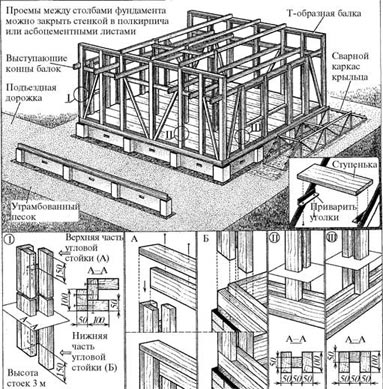 Междуэтажное перекрытие. Балки перекрытия берут сечением 100х150 мм. Опираются они на поперечные стены и перегородки. Выступающие за габариты теплой части дома балки сращивают по длине таким образом, чтобы места соединений приходились на стены. Для установки стропил и стен верхнего этажа необходимо сделать по балкам перекрытия технологический настил, а снаружи дома – устроить леса. Пол в мансарде окончательно настилают после монтажа стропил и изготовления крыши. При этом утеплять пол мансарды с обязательным применением пароизоляции имеет смысл лишь в зоне сауны, если таковая есть на первом этаже. Утепление в этом случае, с одной стороны, просто необходимо для сауны, а с другой – предохраняет мансарду от перегрева в процессе работы сауны. При отсутствии в доме встроенной сауны утеплять пол мансарды нет смысла – правильнее будет в этом случае утеплить крышу.