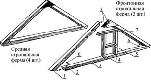 Рис. 4.42. Стропильные фермы: 1 – зуб; 2 – гнездо под зуб; 3 – подстропильный брус; 4 – стойки оконного проема; 5 – поперечина оконного проема; 6 – скобы; 7 – ригель; 8 – металлические косынки