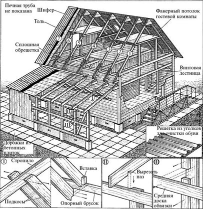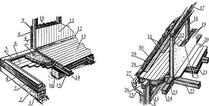 Рис. 4.53. Устройство перекрытий и кровли: 1 – цоколь; 2, 3 – венцы обвязки; 4 – гидроизоляция; 5 – распорные вставки; 6 – черный пол; 7 – утеплитель; 8 – стойки каркаса; 9 – наружная обшивка; 10 – нащельник; 11 – внутренняя обшивка; 12 – плинтус; 13 – чистый пол; 14 – лага; 15 – черепные бруски; 16 – подлаговые столбики; 17 – внутренняя обшивка мансарды; 18 – стойки каркаса мансарды; 19 – стена; 20 – пол мансарды; 21 – потолок первого этажа; 22 – балки перекрытия; 23 – прогонная доска; 24 – прогон; 25 – водосток; 26 – верхняя обвязка каркаса; 27 – слив; 28 – влагозащитная пленка; 29 – обрешетка; 30 – черепица; 31 – стропила; 32 – прогон