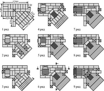 Ряды с 4-го по 9-й. Все-таки возникли определенные сомнения. Дело касается использования огнеупорного кирпича, который согласно правилам в перевязке швов кладки не должен участвовать с обычным красным кирпичом. Тем не менее такое в рядах с 6-го по 9-й, хоть и в незначительной степени, а имеется. Гадать (а более того, экспериментировать), к чему это приведет, не хочется. Какое же можно принять решение? Если ряды, в которых участвуют шамотные кирпичи, целиком класть из них, проблема решится. Это в нашем случае оправдано как минимум с 5-го ряда тем, что там в топливнике кладется колосниковая решетка, т. е. начинается самая теплонапряженная зона. Но тут вопрос чисто дизайнерский: если печь и камин после кладки отделывать ничем не предполагается, то как они в итоге будут выглядеть?
