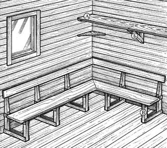 Описываемая конструкция весьма вариабельна. Посмотрите на рис. 6.3. Если в качестве задних стоек опор использовать стойки каркаса постройки (в случае наличия таковых), разумеется, до внутренней обшивки стены в зоне расположения скамьи, то получается «встроенная в стену» лавка, а расход материала на нее уменьшается (не нужно задних стоек как таковых), причем в этом случае можно сэкономить и материал обшивки стены и пола, заменив его более простым на площадях, занимаемых скамьей (лавкой). Для монтажа спинки в этом случае можно использовать бобышки-клинья, аналогичные тем, что используются при сплачивании половых досок. Поскольку длины поперечин опор, как правило, больше ширины сиденья, между сиденьем и стенкой образуется просвет, который можно перекрыть, например, фанерной крышкой на петлях. Тогда при наличии лицевой панели пространство «под лавкой» превращается в «сундук», аналогично скамьям в спальных железнодорожных вагонах. Естественно, откидным может быть выполнено и само сиденье.