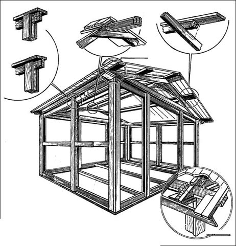Чаще всего это делается так: на «капитальные» фронтоны и поперечные перегородки опираются «мощная» коньковая балка, мауэрлаты и параллельные им прогоны, на которых базируются собственно стропила. Большая жесткость на изгиб продольных балок обычно обеспечивается слишком большим их сечением, что противоречит концепции решения нашей задачи. Посмотрим, что можно сделать в случае маленьких построек.