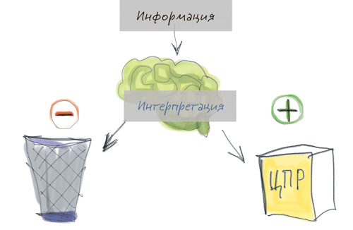 Итак, вся полученная информация оценивается, анализируется и, главное, интерпретируется. Мозг задает две модальности: позитивную и негативную. Но самое интересное происходит дальше, ведь после этого наш мозг направляет информацию либо в так называемую «корзину», либо в центр принятия решений. Конечно, никаких корзин и центров нет, это чистой воды метафора, однако в целом она достаточно верно отражает сложные процессы, которые происходят у нас в голове.