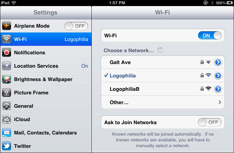3. Отключите функцию «Спрашивать о подключении к новым Wi-Fi-сетям» (Ask to Join Networks), как показано на рис. 1.3. Теперь iPad больше не будет задавать вопросов о подключении к Wi-Fi-сетям!