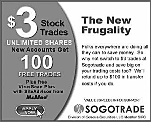 Объявление предлагает сэкономить на комиссионных, воспользовавшись услугами брокерской фирмы Sogotrade; новичкам обещают возместить до 100 долл. расходов на открытие счета и ряд других выгод. Размер комиссионных – 3 долл. – выгоднее, чем во втором объявлении. Есть призыв к действию в виде кнопки «Применить сейчас». Прим. перев.