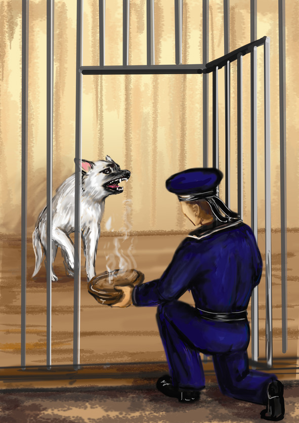 Василий КнязевУтром, вновь появились эти люди с котелками, в которых была еда. Пальма ждала этого человека. Ей почему-то было стыдно за свой вчерашний поступок. Она ни за что обидела и причинила боль этому парню. Матрос поставил котелок на пол и удивленно посмотрел на собаку, которая не просто не рычала, а даже виляла хвостом. Пальма подошла ближе и, не понимая своего поступка, лизнула руку этого странного парня. Парень засмеялся и, потрепав, ее по холке вышел из Вольера, давая собаке спокойно доесть похлебку.