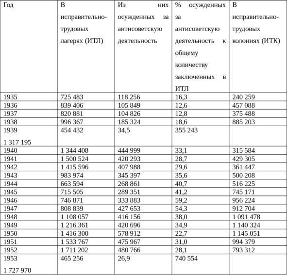 2. Отсутствие в опубликованной выше таблице данных по ИТК и тюрьмам. На самом деле статистика по всему ГУЛАГу не сильно изменит картину. Так, на 1 января 1941 года в ИТЛ и ИТК содержалось 1 876 834 заключенных, из них 555 589 (29,6%) отбывали наказание за «контрреволюционные преступления» 81 . К тому же большинство осужденных через какой-то время из тюрем и ИТК попадали в ИТЛ.