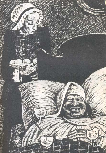 Старуха отнесла наседке это новое прибавление семейства, и та отчаянно клохтала, взъерошив перья и растопырив крылья, чтобы укрыть всех своих цыплят.