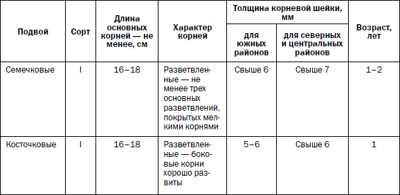 Как правило, практикуется двухлетнее выращивание подвоев, поскольку за один сезон в северных регионах, а в средней полосе при аномально холодном лете необходимых кондиций достигает небольшая часть растений. Те из них, которые будут соответствовать техническим условиям (ОСТ 46-79-80 и ОСТ 46-86-80), могут использоваться в качестве подвойного материала (табл. 2).