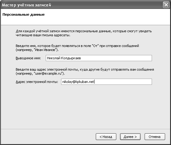 Поскольку по умолчанию отмечен пункт создания учетной записи электронной почты, то просто нажмите кнопку Далее. На следующей страничке от вас потребуется ввести персональные данные. Они будут отображаться в заголовках ваших сообщений у того, кому вы напишете. Введите свое полное имя, адрес электронной почты и нажмите кнопку Далее (рис. 1.21).