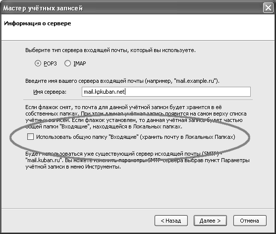 Обратите внимание на нижнюю часть окна (рис. 1.22). По умолчанию там установлен флажок напротив пункта Использовать общую папку «Входящие» (хранить почту в Локальных Папках). Это означает, что, если вы настроите несколько таких учетных записей, то при получении почты все сообщения будут сваливаться в одну кучу в локальной папке «Входящие». В век повального индивидуализма такой обезличивающий подход неприемлем. Снимите этот флажок. Даешь каждому свою папку «Входящие»!