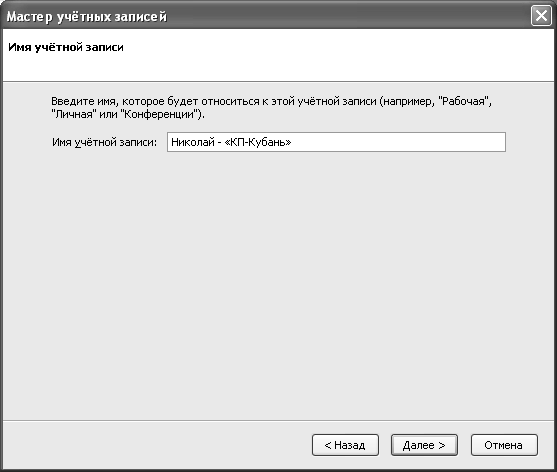 Рис. 1.24. Имя учетной записи может быть любым, но я считаю, что оно должно быть осмысленным, поэтому ввел свое имя и название организации, предоставившей электронный почтовый ящик
