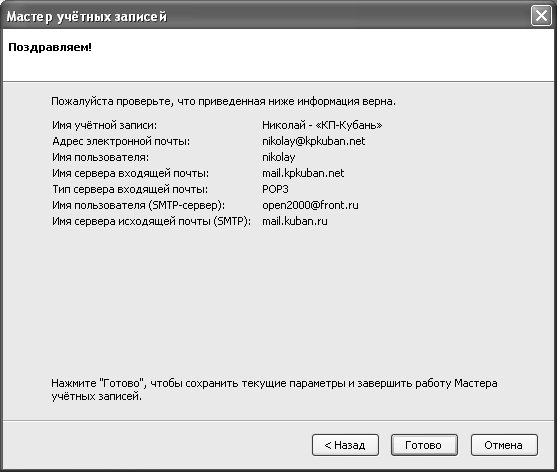 И наконец, итоговая страничка мастера, на которой будут представлены все введенные вами данные для проверки (рис. 1.25). Обнаруженные здесь ошибки еще не поздно исправить, вернувшись на несколько шагов при помощи кнопки Назад. А если все в порядке, нажмите кнопку Готово. Учетная запись создана. Можно приступать к приему почты или ввести несколько дополнительных параметров в окне Параметры учетной записи.