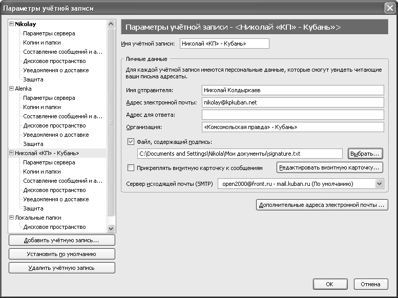 Первым делом рекомендую «пристегнуть» к учетной записи файл, содержащий подпись. Для этого создайте простой текстовый файл, содержащий ваше имя, адрес электронной почты, телефон, и сохраните его, например, в папке «Мои документы» под именем signature.txt. Затем снова откройте диалоговое окно Параметры учетной записи, выделите созданную вами учетную запись и отметьте галочкой пункт Файл, содержащий подпись (рис. 1.26). При помощи кнопки Выбрать отыщите созданный вами файл подписи.