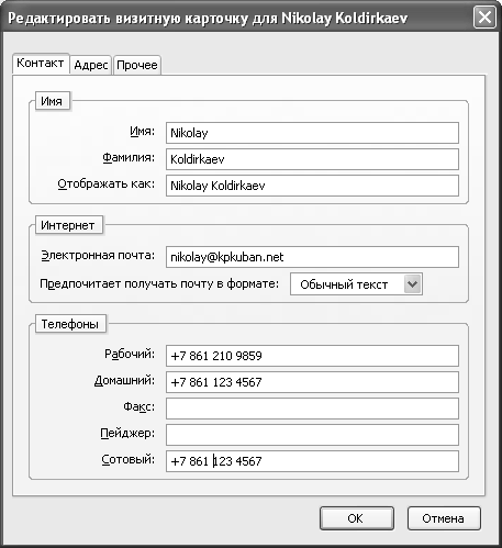 Кроме присоединения файла подписи, в программе Thunderbird есть возможность создания визитной карточки специального формата vCard (рис. 1.27). Этот формат используют многие почтовые программы, органайзеры и планировщики для обмена данными контактов. Получив от вас визитную карточку при помощи одной из таких программ, пользователь сможет быстро добавить все необходимые данные о вас в свою адресную книгу.