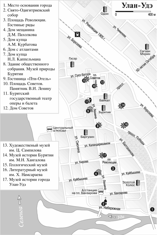 Главная улица города – им. Ленина. Она начинается от наб. Уды и Одигитриевского собора и идет до пл. Советов. От ул. Кирова до Советской – пешеходная часть. В этой части города купеческие особняки – памятники деревянного и каменного зодчества русского классицизма – напоминают о прошлом. Среди них деревянные дома, украшенные богатой резьбой, Гостиный двор, Одигитриевский собор. Современные здания украшены витражами, мозаичными панно с бурятским орнаментом, это позволяет сохранить национально-художественные традиции столицы Бурятии.