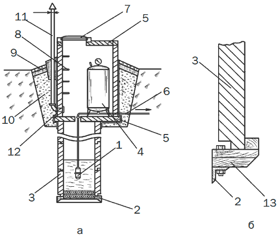 Рис. 10. Шахтный колодец с технической камерой для гидропневматического бака: а – общий вид (в разрезе); б – устройство ножа (разрез); 1 – вибрационный насос; 2 – нож; 3 – бетонное кольцо; 4 – гидропневматический бак; 5 – плита перекрытия; 6 – подающий трубопровод; 7 – крышка; 8 – ходовые скобы; 9 – отмостка; 10 – глиняный замок; 11 – вентиляционный стояк; 12 – гидроизоляция; 13 – деревянная обойма.