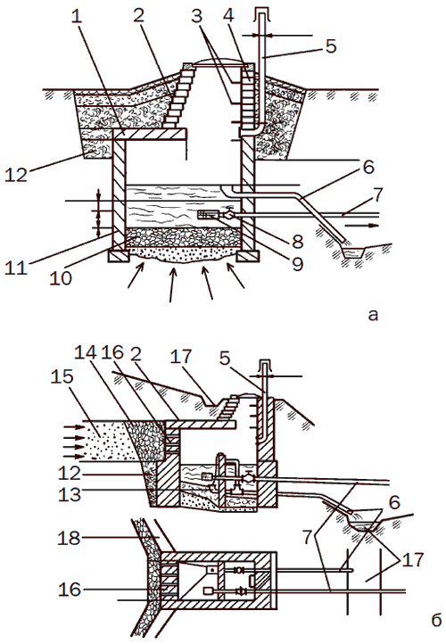 Рис. 17. Устройство каптажных камер для родников: а – восходящий родник; б – нисходящий родник; 1 – плита перекрытия; 2 – гидроизоляция; 3 – ходовые скобы; 4 – кирпичная кладка; 5 – вентиляционный стояк; 6 – переливная труба; 7 – водозаборная труба; 8 – вентиль; 9 – фильтр; 10 – обратный гравийный фильтр; 11 – бетонное кольцо; 12 – глиняный замок; 13 – сливная воронка с пробкой на цепи; 14 – гравийный фильтр; 15 – водоносный слой; 16 – дренажная стенка; 17 – нагорная водоотводная канава; 18 – открылки.