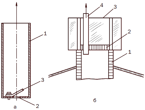 Рис. 18. Бадья для извлечения воды из трубчатого колодца: 1 – стальной стакан; 2 – отверстие в дне стакана; 3 – клапан-«язычок»; 4 – вентиляционный стояк.