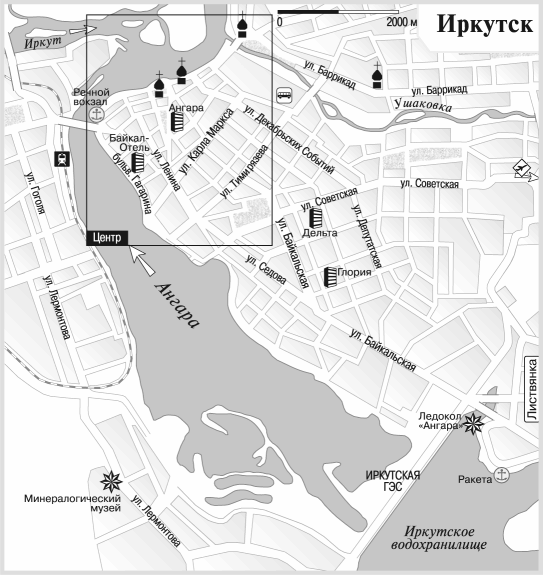 (5192 км к востоку от Москвы, 5862 км к востоку от Санкт-Петербурга, 68 км от Байкала (пос. Листвянка))
