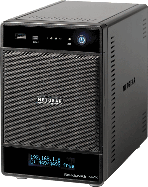 Самый эффективный способ организовать централизованную домашнюю медиабиблиотеку – воспользоваться специализированной системой хранения данных (СХД) того же класса, что может работать в условиях предприятия среднего или малого бизнеса. Именно к такому классу устройств относятся СХД компании NETGEAR из серии ReadyNAS NVX. Эта новая серия объединяет достоинства прежних модельных рядов, нацеленных на домашний сегмент рынка (ReadyNAS Duo) и на офисное применение (ReadyNAS Pro). В настоящее время в серию входят две модели – RNDX4210 и RNDX4410, которые различаются лишь числом поставляемых вместе с ними 3,5-дюйм накопителей емкостью 1 Тбайт. В СХД серии ReadyNAS NVX предусмотрена установка максимум четырех жестких дисков, и в модели RNDX4410 присутствуют как раз четыре. Вариант же RNDX4210, который мы изучили в нашей лаборатории, предлагается укомплектованным двумя дисками по 1 Тбайт каждый.