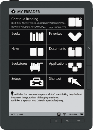Первая в мире электронная книга с 9-дюйм сенсорным дисплеем. Внешне выглядит очень изящной и тонкой, а наличие чувствительного к касаниям экрана значительно упрощает управление книгой. В устройстве реализовано несколько интересных функций, таких как автоматическая переверстка текста, загрузки контента из Интернета, работа в портретном и ландшафтном режимах, словари с озвучкой слов и др. www.asus.ru
