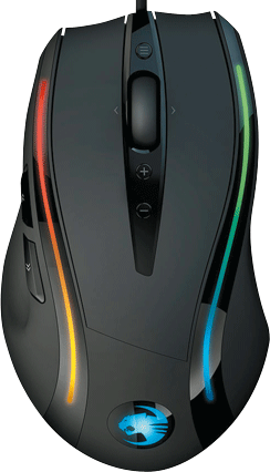 Профессиональная игровая мышь на базе лазерного датчика ProAim с разрешением 3200 точка/дюйм оснащена светодиодной подсветкой, имеет 72-МГц процессор TurboCore и 128-Кбайт память (для сохранения настроек). У этой мыши регулируются масса, чувствительность по осям X и Y, скорость четырехпозиционного колеса прокрутки, профили и др. www.roccat.org