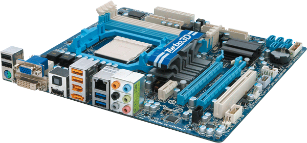 НМС AMD подобной половинчатостью в отношении прогрессивных веяний ИТ-рынка не страдают. Самый передовой набор системной логики этой компании, 890GX, штатно обеспечивает работу SATA 3.0 и предлагает для организации всевозможных интерфейсов 24 полноскоростных (а не уполовиненных по полосе пропускания, как в случае Intel Q57/H57/H55) канала PCI Express 2.0. Конечно, построенные на AMD 890GX системные платы к бюджетной категории отнести трудно, но и запредельными цены на них не назовешь. А следом за лидером компания выпустила и НМС более скромных характеристик – 880G (с «южным мостом» SB800), прямой наследник морально устаревшего AMD 785G. Именно «средний» по возможностям новейший набор системной логики и лег в основу платы, которую мы в данном случае рассматриваем, – GIGABYTE 880GMA-UD2H.