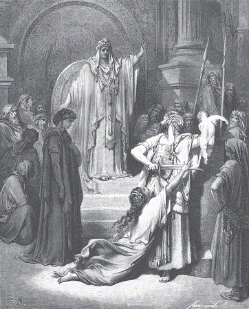 16 Тогда пришли две женщины блудницы к царю и стали пред ним. 17 И сказала одна женщина: о, господин мой! я и эта женщина живем в одном доме; и я родила при ней в этом доме; 18 на третий день после того, как я родила, родила и эта женщина; и были мы вместе, и в доме никого постороннего с нами не было; только мы две были в доме; 19 и умер сын этой женщины ночью, ибо она заспала его; 20 и встала она ночью, и взяла сына моего от меня, когда я, раба твоя, спала, и положила его к своей груди, а своего мертвого сына положила к моей груди; 21 утром я встала, чтобы покормить сына моего, и вот, он был мертвый; а когда я всмотрелась в него утром, то это был не мой сын, которого я родила. 22 И сказала другая женщина: нет, мой сын живой, а твой сын мертвый. А та говорила ей: нет, твой сын мертвый, а мой живой. И говорили они так пред царем. 23 И сказал царь: эта говорит: мой сын живой, а твой сын мертвый; а та говорит: нет, твой сын мертвый, а мой сын живой. 24 И сказал царь: подайте мне меч. И принесли меч к царю. 25 И сказал царь: рассеките живое дитя надвое и отдайте половину одной и половину другой. 26 И отвечала та женщина, которой сын был живой, царю, ибо взволновалась вся внутренность ее от жалости к сыну своему: о, господин мой! отдайте ей этого ребенка живого и не умерщвляйте его. А другая говорила: пусть же не будет ни мне, ни тебе, рубите. 27 И отвечал царь и сказал: отдайте этой живое дитя, и не умерщвляйте его: она – его мать. 28 И услышал весь Израиль о суде, как рассудил царь; и стали бояться царя, ибо увидели, что мудрость Божия в нем, чтобы производить суд.