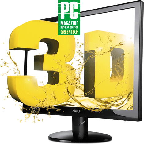 Широкоформатный монитор с возможностью отображения трехмерной картинки. Диагональ матрицы 23 дюйма, разрешение – 1920x1080, яркость – 300 кд/м2, время отклика пиксела 5 мс. После активации 3D-режима пользователь может надеть специальные очки (поляризационного типа) и видеть практически трехмерную картинку. www.aoc-europe.com