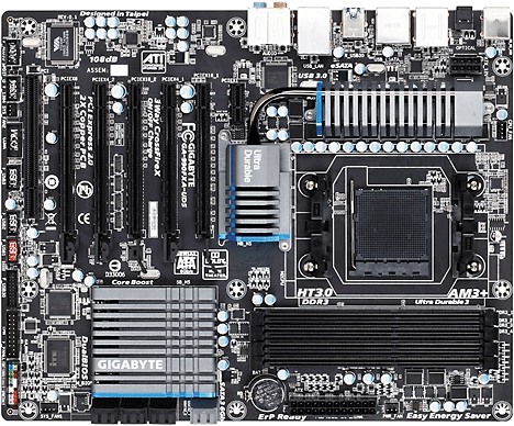 Системная плата из новой серии плат компании GIGABYTE для процессоров AMD FX на базе НМС AMD 900-й серии. Эта модель совместима с восьмиядерными процессорами AMD FX, обеспечивает возможность создания составных видеоподсистем в режиме ATI CrossFireX и NVIDIA 4-way SLI. В плате используются основные фирменные технологии GIGABYTE (транзисторы Ultra Durable 3, средства Driver-MOSFET, 333 Onboard Acceleration, DualBIOS и др.). www.gigabyte.ru