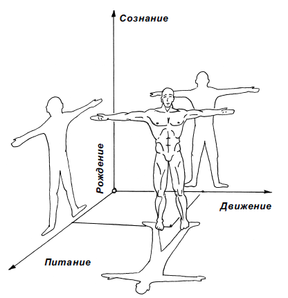 Для того чтобы человек мог полнокровно жить и быть «проявленным» в этом мире, ему необходимо «проявлять себя» по всем трем осям: фигура между двух осей будет плоской, как бумажный силуэт. И человек должен предпринимать для этого сознательные созидательные усилия.