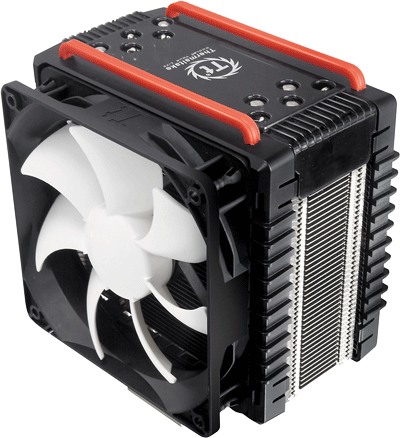 Основание из алюминия и меди, которое в Thermaltake Frio контактирует непосредственно с процессором, передает тепло на алюминиевый радиатор посредством пяти 8-мм тепловых трубок. Скорость вращения 120-мм вентилятора (или двух вентиляторов; один из них закреплен на радиаторном блоке изначально, второй входит в комплект и может быть установлен самим сборщиком) меняется в пределах 1200–2500 об/мин. При этом уровень шума – от 20 до 43 дБ, а максимальная величина прогоняемого через систему воздушного потока – 174 м3/ч.