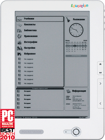 Книга – источник знаний. А электронная книга чем хуже? «Ничем», – решили в компании PocketBook и выпустили как раз к 1 сентября 2010 г. новую «читалку» под нехитрым названием PocketBook Education. Цель создателей новинки (в рабочую группу вошли дизайнеры интерфейса, психологи и другие специалисты) весьма амбициозна: «читалка» должна помочь своему владельцу в эффективной организации любого учебного процесса, будь то самообразование, учеба в школе или университете, написание диссертации или иные формы обучения. Экран «читалки» с диагональю 9,7 дюйма и разрешением 1200x825 изготовлен по технологии E Ink и отображает до 16 градаций серого. Батареи на 1530 мА·ч хватает для показа 7 тыс. страниц, 256-Мбайт ОЗУ дополняет 2-Гбайт флэш-память и гнездо для карт microSD. Помимо порта microUSB, для связи с компьютером могут использоваться WiFi и Bluetooth. В комплект PocketBook Education входят шесть словарей: английский, немецкий, французский, испанский, русский, португальский; режим чтения предусматривает расширенный набор функций («Заметка», «Активное содержание», «Быстрый поиск») и систему виджетов. Возможно использование электронных книг всех распространенных форматов, а также изображения и MP3.