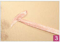 4. В конце работы выведите ленту на изнаночную сторону ткани и обрежьте на расстоянии 20 мм от поверхности. Закрепите ленту ниткой, сделав несколько стежков петельного шва.