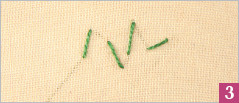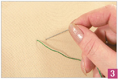 1. Выведите иглу с изнаночной стороны ткани на лицевую. Снова введите ее в ткань на расстоянии 1 мм от первого прокола. Выведите кончик иглы на лицевую сторону на расстоянии 3–4 мм от места входа перпендикулярно к линии шва, не протаскивая иглу через ткань.