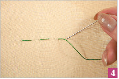 2. Выведите иглу с изнаночной стороны на лицевую на расстоянии 3–4 мм слева от стежка немного дальше его окончания.