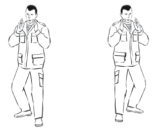 Рабочая стойка аналогична предыдущей, только снимаем либо левостороннее, либо правостороннее сложение (рис. 3), голова слегка опущена либо смотрит по горизонту (очень похоже на боксерскую стойку), руки могут быть чуть впереди либо чуть ближе к туловищу, плечи спокойно опущены, спина прямая.