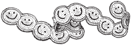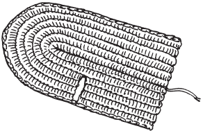 На лицевой стороне кружка вышить черной нитью 2 глаза и улыбающийся рот. Связать 14–16 (или больше) кружков и соединить их между собой в полосу, а затем обвязать по контуру 1 рядом полустолбиков с накидом и 1 рядом «рачьего шага» (рис. 22).