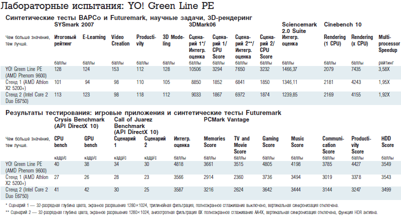 Мы протестировали изделие Ultra Electronics, сравнив его показатели с двумя системами на базе процессоров с одинаковыми частотами – 2,6-ГГц AMD Athlon X2 5200+ (ядро Windsor, НМС AMD 790FX) и 2,66-ГГц Intel Core 2 Duo E6750 (ядро Conroe, НМС Intel P35 Express). Характеристики прочих компонентов испытательных стендов были идентичны (модули ОЗУ во всех случаях работали в режиме DDR2-800). Нетрудно видеть, что YO! Green Line РЕ легко обходит оппонентов на всех без исключения тестах (см. дополнительные материалы по этой теме на нашем компакт-диске). Преимущество новой платформы особенно заметно на задачах, связанных с трехмерным моделированием и преобразованием видеоконтента. Когда ПО в состоянии корректно распознать и загрузить работой все четыре «феноменальных» ядра, прирост скорости ощутимый.
