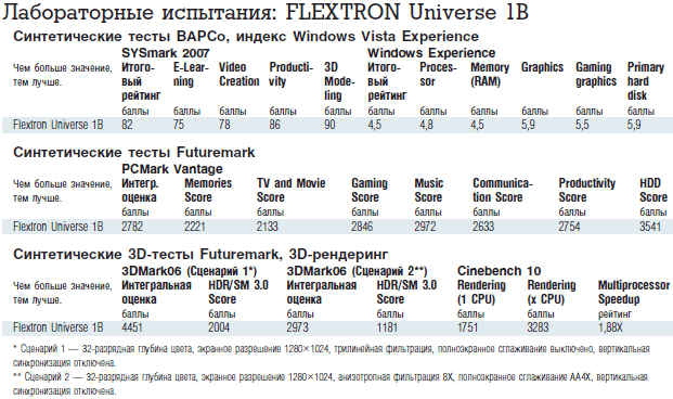 Сопоставив показатели FLEXTRON Universe 1B с результатами систем схожего назначения (см. PC Magazine/RE, 7/2007, с. 44), заметим, что компания-изготовитель вывела на рынок хорошо сбалансированную модель, правильно расставив акценты при выборе базовых компонентов.