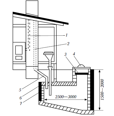1) дымоход; 2) люфт-канал; 3) деревянная крышка; 4) чугуная крышка; 5) вытяжка; 6) глиняный замок; 7) кирпич