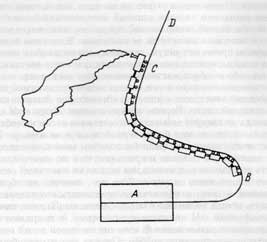 Сновидец знает, что должен отправиться на важную конференцию, и берет свой портфель. Замечает, что время поджимает, поезд скоро отойдет, и начинает суетиться, боясь опоздать. Он пытается собрать свою одежду: шляпы нет, пальто лежит на месте. Бегает по всему дому, в поисках того и другого, и кричит: «Где мои вещи?» В конце концов все находится, и герой выбегает из дому. При этом обнаруживается, что забыт портфель. Он возвращается за портфелем и смотрит на часы, убеждаясь в том, что действительно опаздывает. Затем бежит на станцию по дороге, которая до странности настолько мягкая, что будто бежишь по мху, и ноги двигаются с большим трудом. Задыхаясь, наш герой прибегает на станцию и видит, что его поезд только что ушел. Тут его внимание привлекает железнодорожное полотно, которое выглядит примерно как на рис. 8. Сновидец находится в А, хвост поезда уже в В, а паровоз в С. Он наблюдает за составом, огибающим всей своей длиной кривую, и думает при этом следующее: «Если машинист достаточно умен, то сообразит, подойдя к точке D, не давать полный пар, так как если он это сделает, то длинный состав, все еще огибая кривую, сойдет с рельс». Паровоз подходит к D, и машинист дает полный пар: паровоз резко тянет состав вперед. Сновидец видит разворачивающуюся катастрофу – состав сходит с рельс – и кричит, просыпаясь в кошмарном страхе.